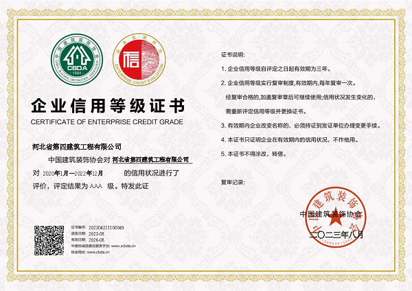 此次获得中装协AAA级企业信用等级证书,是中装协对公司坚持守法经营、诚信经营的充分肯定和高度认可,是对河北四建实力和品牌形象的最好诠释。(质量技术部)