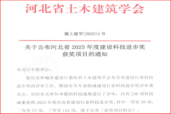 7月3日,河北省土木建筑学会公布了2025年度河北省建设科技进步奖名单。公司凭借扎实的科技创新与技术攻关能力,一举斩获16项科技成果奖项,其中,一等奖1项、二等奖4项、三等奖11项。